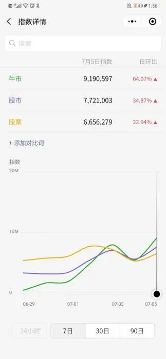 微信指数显示,关于“牛市”的讨论日益高涨,7月5日已飙升至919万,日环比达64.07%;百度指数显示,关于“牛市”的搜索在7月3日达到高点。