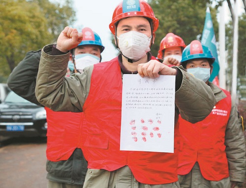 国网湖北武汉供电公司火神山医院供电保障队队员写下请战书。